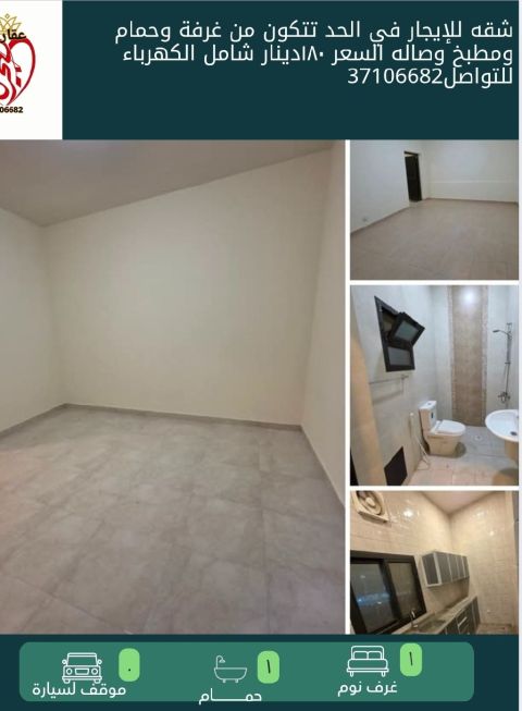 Apartment for rent in Al Hidd, consisting of one bedroom, a bathroom, a kitchen, and a living room. The price is 180 dinars including electricity. For contact.