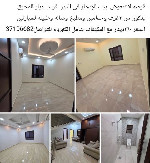 An unmissable opportunity: a house for rent in Al Dair, close to Diyar Al Muharraq. It consists of 3 rooms, 2 bathrooms, a kitchen, a living room, and parking for two cars. The price is 260 dinars with air conditioners, including electricity. For contact.