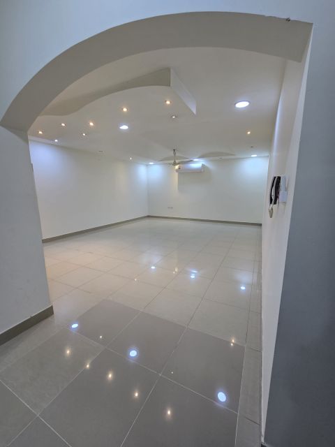 A large apartment for rent in New Arad, containing 3 bedrooms, 3 bathrooms, a living room, and a kitchen. Excellent and quiet location, close to services and schools. Price is 220 Bahraini dinars, negotiable. Please contact