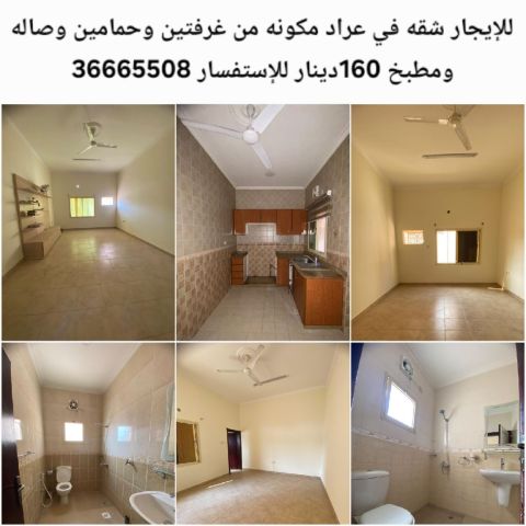 For rent: a spacious apartment in the Arad area, near all services and Khadija Mosque. It consists of 3 bedrooms, 3 bathrooms, a closed kitchen, a living room, and a wide balcony, on the third floor. Rent is 270 dinars, including electricity and water. An excellent and unique opportunity for families. For serious inquiries, contact.
