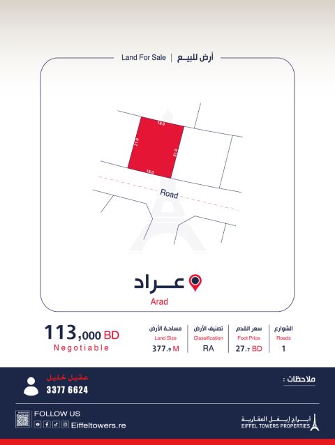 Eiffel Towers Real Estate Company offers for sale a land in Arad with an area of 377.9 square meters, classified as private residential (RA). Price per square foot is 27.7 Bahraini dinars, total price is 113,000 Bahraini dinars. For contact: Aqeel Khalil, eiffeltowers.re, licensed broker by the Real Estate Regulatory Authority, license number B202403/1257.