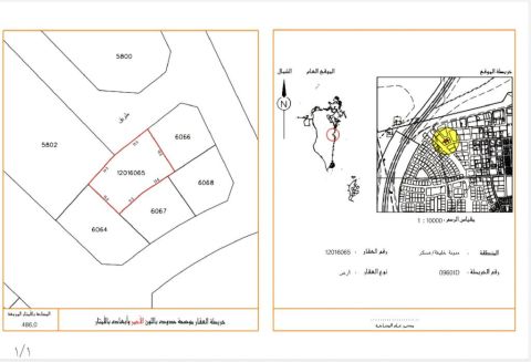 للبيع أرض في عسكر / مدينة خليفة، المساحة 486 متر مربع، السعر 120 ألف دينار. موقع مميز وقريب جداً من مدخل ومخرج المنطقة (شارع الملك حمد)، قريب من مسجد علي بن محمد الكعبي.