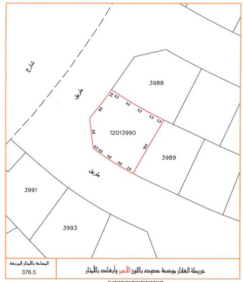 Land for sale in Askar - Ras Hayan, on two streets and a corner. Area 387.4 SQM. Classification RA. Price per square foot 21.5 dinars. Total price 89654 dinars