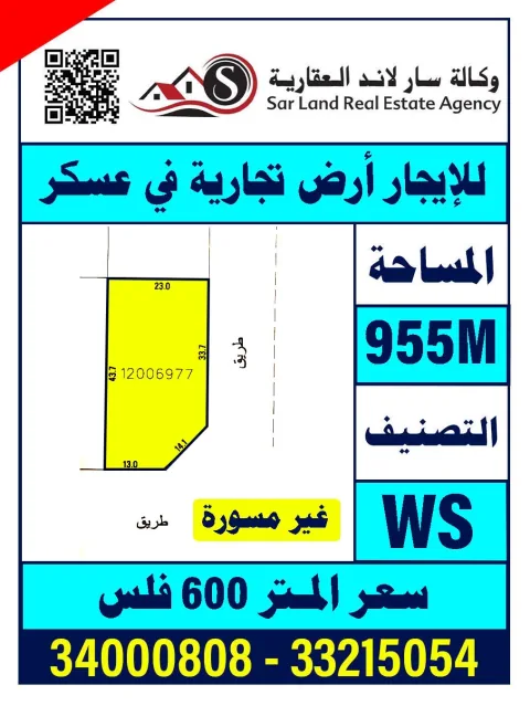 عقار للإيجار: أرض صناعية في عسكر، المساحة 635 متر مربع، التصنيف صناعي WS، السعر الإجمالي 300 دينار. المرجع LR1732.