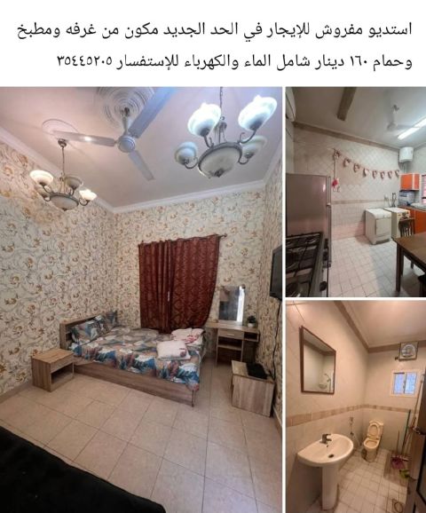 Furnished studio for rent in Al Hadd Al Jadeed, consisting of a room, kitchen, and bathroom, 160 dinars including water and electricity.