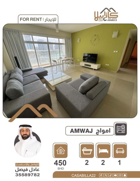 For rent - a distinctive apartment in Amwaj with a wonderful view of the lagoon in an upscale and beautiful location. Apartment details: two bedrooms - a spacious living room - two bathrooms - a fully equipped kitchen - a balcony with a direct view of the lagoon. Monthly rent: 450 dinars. For contact and inquiries.