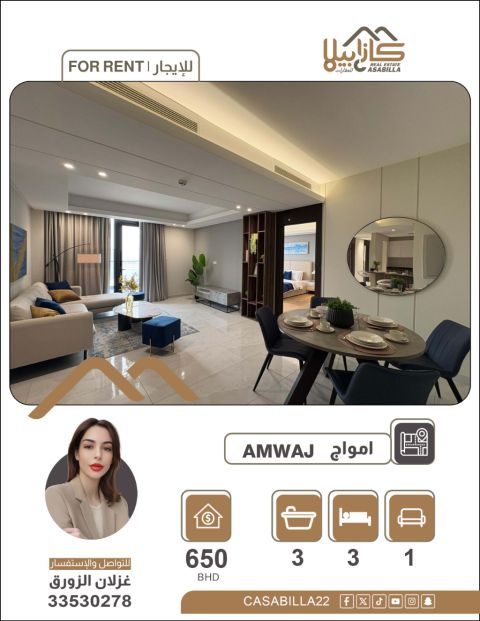 Apartment for rent in the Amwaj area. A fully furnished apartment for rent in Amwaj Islands - 3 bedrooms. Enjoy a luxurious and comfortable living experience in the heart of Amwaj Islands. A spacious and fully furnished apartment with elegant furniture, featuring a complete family design that provides privacy and comfort with double balconies and beautiful views, ready for immediate occupancy. 3 bedrooms, kitchen, living room, 3 bathrooms, 2 balconies. Price 650 dinars, electricity 30 dinars, furnished. For contact.