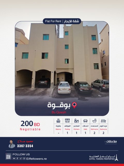 شركة أبراج أيفل العقارية تقدم شقق للإيجار في أبو قوة. الشقة تتكون من 2 غرف نوم، صالة كبيرة، مطبخ، 2 حمام، بارك، ومصعد. قيمة الإيجار 200 دينار بحريني، غير شامل. للتواصل: محمود صلاح، eiffeltowers.re، eiffeltowers.re. الشركة وسيط معتمد من قبل مؤسسة التنظيم العقاري، رقم الترخيص B202403/1257.
