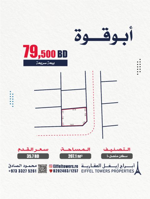 شركة أبراج أيفل العقارية تعرض للبيع أرضا في بو قوة بمساحة 207.1 متر مربع. التصنيف سكن متصل ( أ RHA) سعر القدم المربع 35.7 دينار بحريني السعر الاجمالي 79500 دينار بحريني. للتواصل محمود الصادق، eiffeltowers. re، eiffeltowers. re. وسيط مرخص ومعتمد من قبل مؤسسة التنظيم العقاري، رقم الترخيص B202403 / 1257