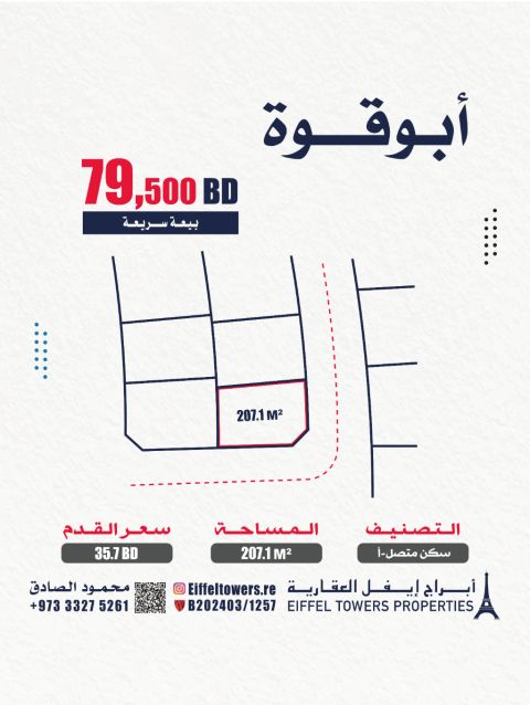 شركة أبراج أيفل العقارية تقدم للبيع قطعة أرض في بو قوة. المساحة 207.1 متر مربع مصنفة كسكني متصل (ARHA) سعر القدم المربع 35.7 دينار بحريني والسعر الاجمالي 79500 دينار بحريني. للكاش فقط. للتواصل محمود الصادق