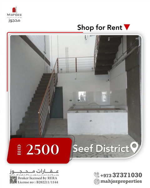 For rent, a commercial shop in Seef area suitable for various activities and commercial projects. A distinguished and strategic location close to all services and shopping malls. The shop area is 164 SQM with a terrace, totaling 586 SQM. The rental opportunity is for 3000 dinars