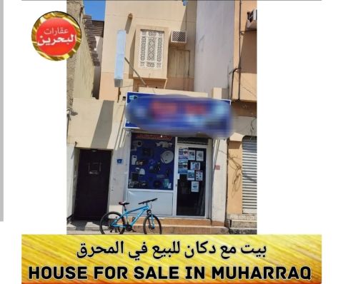 A house with a shop for sale in Muharraq, consisting of 4 rooms, 3 bathrooms, a living room, a kitchen, a courtyard, and a commercial shop. The land area is 92 square meters. The price is 80 thousand.