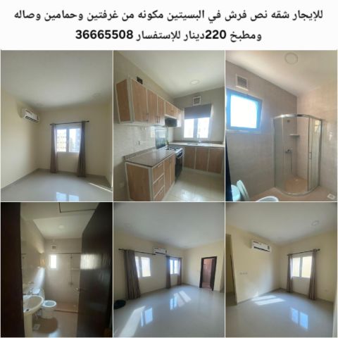 للإيجار شقة في البسيتين مكونة من غرفتين نوم، حمام، صالة، مطبخ نصف مفروش، وغرفة خادمة أو مخزن. سعر الإيجار 270 دينار بحريني، غير شامل