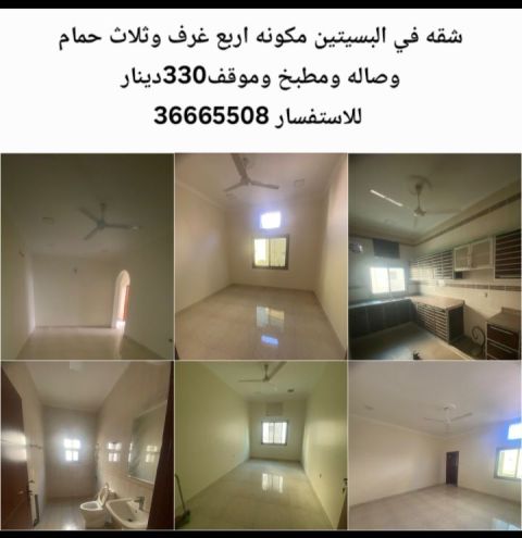 A four-bedroom apartment for rent in Al-Busaiteen, consisting of four rooms, three bathrooms, a living room, and a kitchen, for 330 dinars.