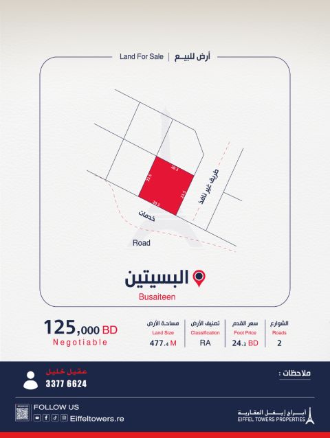 شركة أبراج أيفل العقارية تعرض للبيع أرضاً في البسيتين بمساحة 477.4 متر مربع، مصنفة كسكن خاص (أ RA). سعر القدم المربع هو 24.3 دينار بحريني، والسعر الإجمالي هو 125,000 دينار بحريني. للتواصل، اتصل بعقيل خليل عبر eiffeltowers.re. الشركة وسيط معتمد مرخص من قبل مؤسسة التنظيم العقاري برقم الترخيص B202403/1257.
