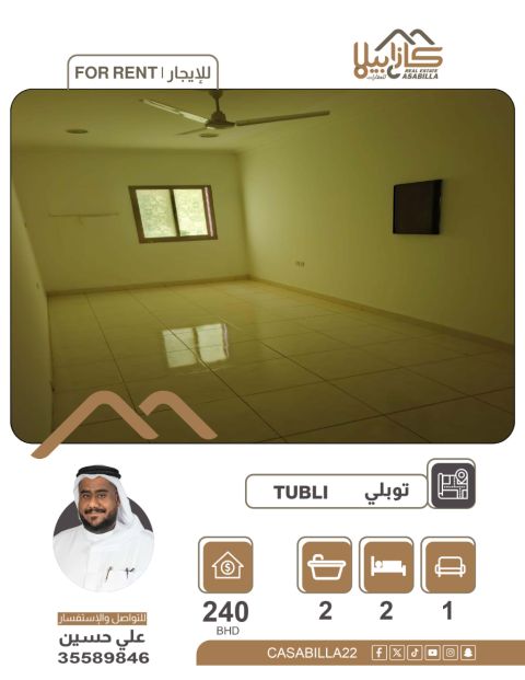 للإيجار شقة غرفة وصالة مع الكهرباء مشمولة، تقع في منطقة توبلي بالقرب من ممشى توبلي. الشقة مكونة من غرفة نوم واحدة، وحمام واحد، ومطبخ واحد، وصالة واحدة، ومجهزة بمكيفات هواء، وستائر، وتلفزيون، وبوتجاز. الإيجار المطلوب هو 170 دينارا، يشمل الكهرباء ورسوم البلدية، بدون حد لاستهلاك الكهرباء. للتواصل، اتصل على الرقم