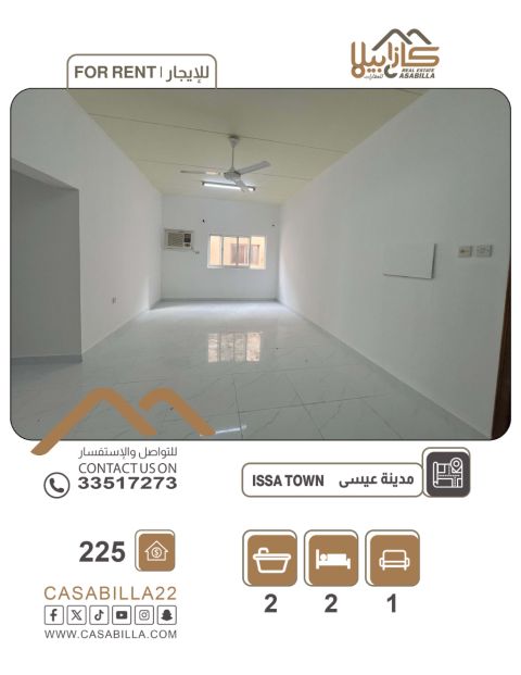For rent: An apartment in Isa Town, Al-Abayat Street, suitable for family living with air conditioners. First, apartment details: two bedrooms, two bathrooms, a living room, and a kitchen. Second, facilities and services: close to services, shaded parking available, air conditioners included. Rent is 225 dinars, including electricity and water. For contact.