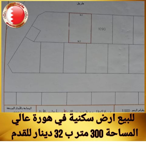 للبيع أرض في هورة عالي على شارع واحد. المساحة: 300.3 متر. التصنيف: RA سكني. سعر القدم: 32 دينار. السعر الإجمالي: 103,424 دينار.