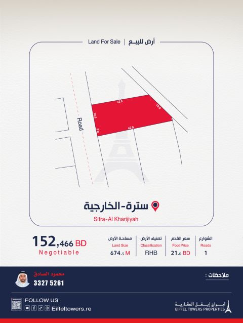 Eiffel Towers Real Estate Company offers for sale a land in Sitra (Al-Kharijiyah) with an area of 674.5 square meters. Classification: Residential connected (with RHB). Price per square foot: 22.7 Bahraini dinars. Total price: 165,000 Bahraini dinars. For contact: Mahmoud Al-Sadiq, eiffeltowers.re, eiffeltowers.re. Licensed broker approved by the Real Estate Regulatory Authority, license number B202403/1257.