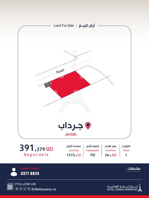 Eiffel Towers Real Estate Company offers for sale a land plot in Jurdab with an area of 1515 square meters, classified as private residential (RB). The price per square foot is 24 Bahraini dinars, and the total price is 391,379 Bahraini dinars. For contact, reach out to Aqeel Khalil via eiffeltowers.re. The company is a licensed broker approved by the Real Estate Regulatory Authority, license number B202403/1257.