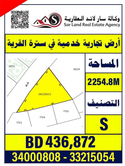 For sale: a commercial land in Sitra Village, 2254.8 square meters, divisible, at a price of 18 dinars per square foot, total price 436,872 dinars.