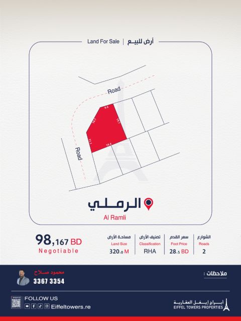 Eiffel Towers Real Estate Company offers for sale a land in Al-Ramli area. The area is 320 square meters, classified as residential connected (A RHA). The price per foot is 28.5 BD, and the total price is 98,167 BD. For contact: Mahmoud Salah, eiffeltowers.re. Licensed broker approved by the Real Estate Regulatory Authority, license number B202403/1257.