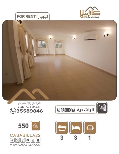 Villa for rent in Rashidiya area. Price 550 dinars, includes electricity and water. semi furnished. Prime location close to all services. Villa details 3 bedrooms (one master) 3 bathrooms, spacious living room, practical kitchen, private garden, gym. A great opportunity for luxurious and comfortable living