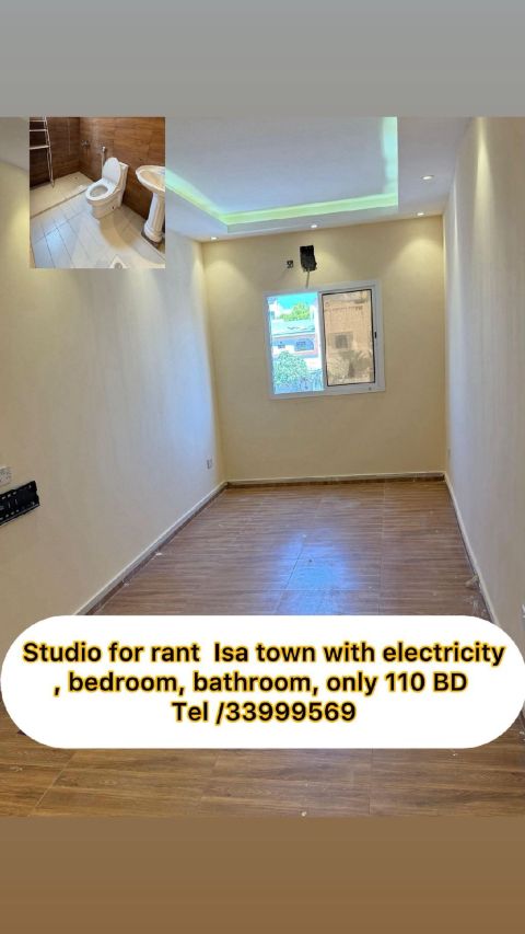 Deluxe semi-furnished studio for rent in Sanad, near the post office. It includes a room, living area, bathroom, and a separate kitchen equipped with air conditioners, a refrigerator, a water heater, an oven, an exhaust hood, central satellite, surveillance cameras, a central intercom system, a high-quality elevator, and 24-hour security. The price is 260 dinars including electricity.