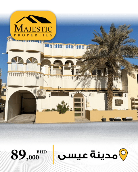 For sale A villa in A'Ali with a swimming pool, gym, large garden, land area of 1337.4 SQM, 6 bedrooms, 5 bathrooms, 2 living rooms, a Majlis, a kitchen, and a garage for 5 cars. asking price is 480000 Bahraini dinars, negotiable. For more information, contact Faisal Madan Abdullah Bumohammad, Alma - ared real estate, Marketing License B201803/ 0021