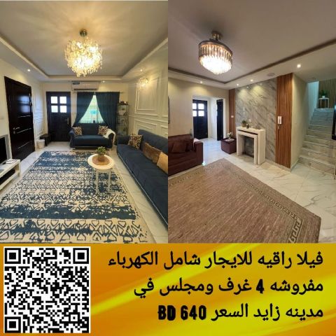 A luxurious villa for rent, including electricity, furnished with elegant furniture in Zayed City. It has 4 bedrooms, a living room, two halls, 2 bathrooms, a kitchen, a courtyard, and a car garage. The price is 650 dinars, including electricity and water. For contact.