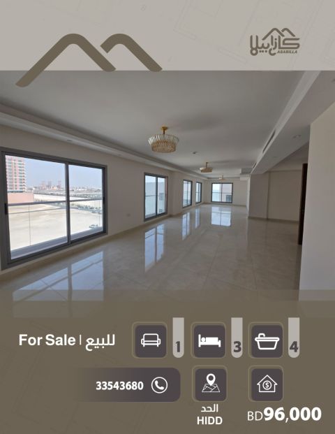 For sale: A new freehold apartment for all nationalities in the Al Hidd area, in a luxurious and elegant tower. First, apartment details: 3 master bedrooms, a spacious living room, a fully equipped kitchen, a maid's room with a bathroom, and central air conditioning. Second, facilities and services: 3 security guards for the building, 2 elevators, a private gym for men, a private gym for women, a swimming pool, an events hall, a children's play area, close to all services and commercial markets, 2 shaded parking spaces per apartment, sea view. Apartment area: 252 square meters. Price: 96,000 BHD.