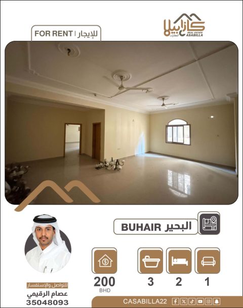 For rent An apartment in Riffa East - Abu Quwara. The apartment is located in a prime and very quiet location, suitable for families, and close to all essential services such as schools, markets, and restaurants, providing a comfortable and easy lifestyle. The apartment features a practical design and comfortable spaces with beautiful natural lighting, offering a quiet and suitable atmosphere for