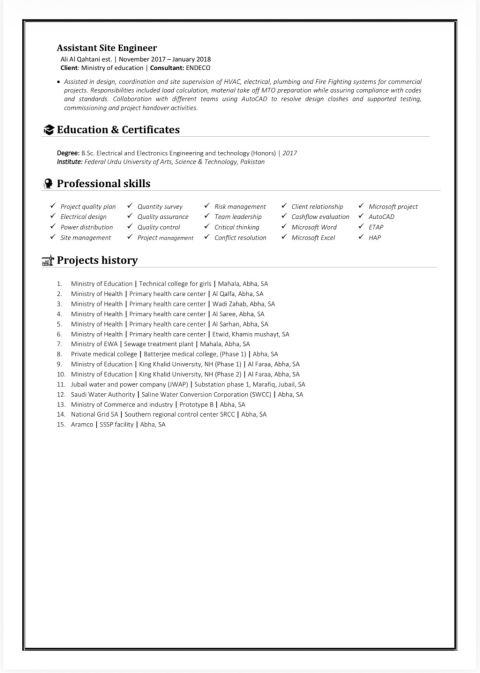 Accomplished Electrical Site Engineer/ Site managerPakistan National living in Abha, Saudi Arabia, Age 30 with 8 + years of MEP, FA and FP systems experience in various projects for ARAMCO, SWCC, JWAP, SRCC, Ministry of Health/ education and various private infrastructure projects. Skilled in managing complete site execution activities, from design coordination and material approval to manpower supervision