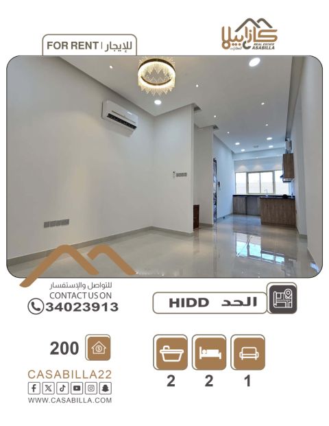 شقة كبيرة وجديدة (ثاني ساكن) مجهزة بمكيفات وستائر. المواصفات: غرفتا نوم، صالة كبيرة، مطبخ، حمامان، موقف سيارة. السعر: 200 دينار بحريني، بدون الكهرباء. للتواصل.