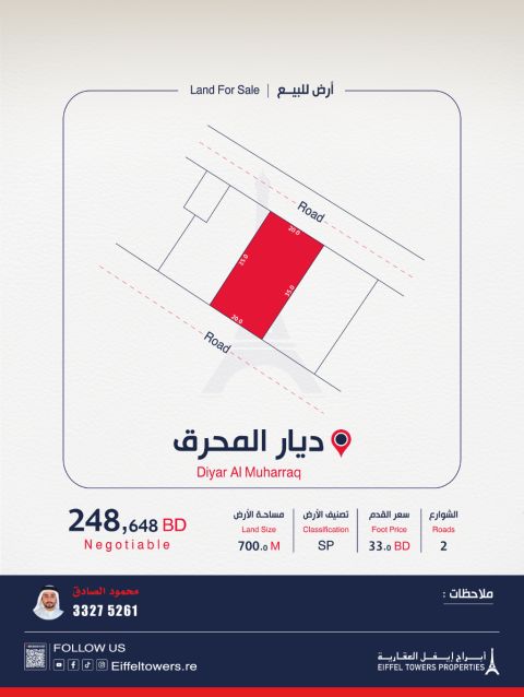 شركة أبراج أيفل العقارية تعرض للبيع أرضاً في ديار المحرق بمساحة 700 متر مربع. التصنيف هو مناطق المشروعات ذات الطبيعة الخاصة - SP. سعر القدم المربع هو 33 دينار بحريني، والسعر الإجمالي هو 248,648 دينار بحريني. للتواصل، اتصل بمحمود الصادق عبر eiffeltowers.re. الشركة وسيط معتمد من قبل مؤسسة التنظيم العقاري برقم الترخيص B202403/1257.