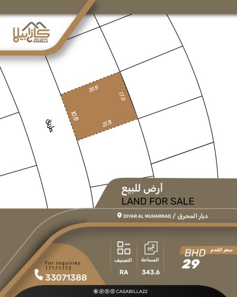 For sale: A freehold land available to all nationalities in a prime location in the Diyar Al Muharraq area, classification RA, area 343.6 square meters, number of streets: one street, price per square foot 29 dinars, total price 107,256 dinars. For contact and inquiries.