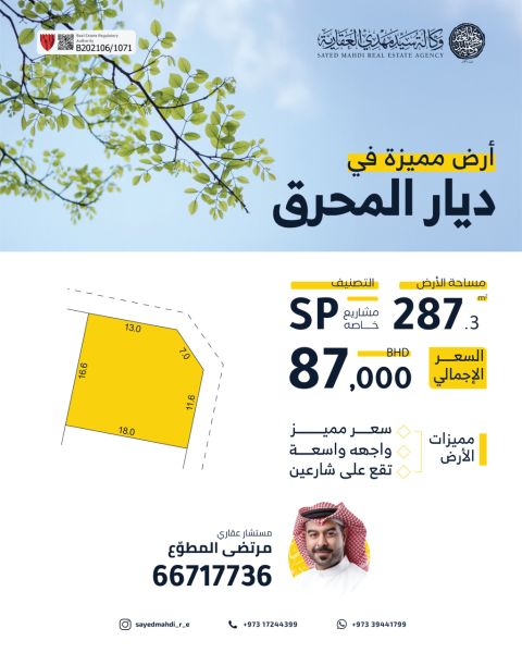 A distinctive residential land in Diyar Al Muharraq. The total price is 87,000 Bahraini dinars. Special projects - SP. The area is 287.3 square meters. For more details, contact the certified real estate broker Mortada Al Mutawa from Sayed Mahdi Real Estate Agency. RERA SA 202307/1206. sayedmahdi - r e mortadha - smre.