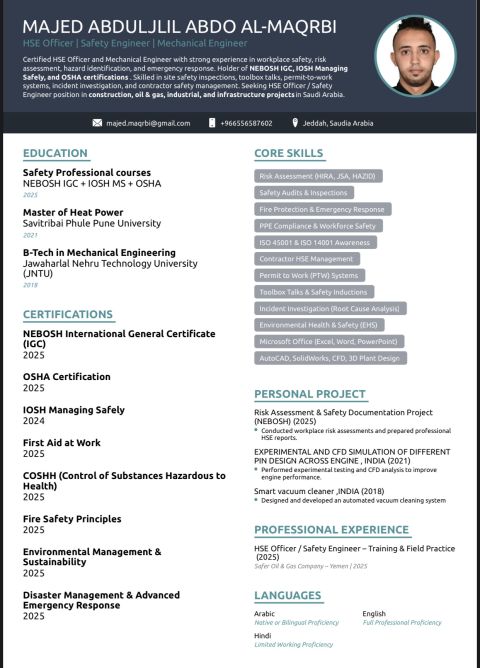 أنا مهندس مدني ومسؤول صحة وسلامة بيئية، بخبرة 5 سنوات في مجال البناء والسلامة الصناعية في المملكة العربية السعودية. أحمل شهادات NEBOSH IGC وIOSH MS وOSHA في سلامة البناء، بالاضافة الى شهادات AoSH المستوى 3 في إدارة البيئة. لدي خبرة واسعة في أنظمة PTW، وتقييم المخاطر، وتفتيشات السلامة في المواقع، والتحقيق في الحوادث، وجلسات "Toolbox talk" والاستجابة للطوارئ، والامتثال
