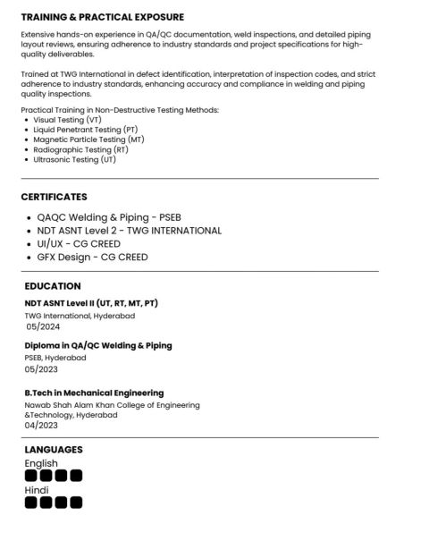I am Mohd Abdul Fouzan, a Mechanical QA/ QC Engineer with experience in welding & piping inspections, QA/ QC documentation, and NDT (ASNT Level II - UT, RT, MT, PT) I am currently looking for suitable opportunities