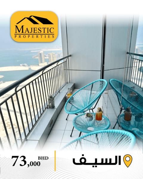 للبيع: شقة مفروشة بالكامل في السيف (برج إيرا) مطلة على البحر. تتكون من غرفة نوم، صالة، مطبخ مفتوح، حمامين، وكونة. المساحة 71 متر مربع. السعر المطلوب 73,000 دينار بحريني. المرجع: MPM3386.