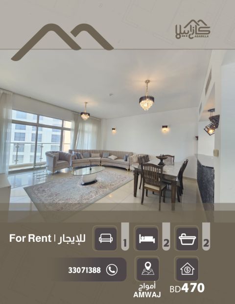 شقة للإيجار في جزر أمواج. مطلة على اللاجون. مفروشة بالكامل. تتكون من غرفتي نوم وحمامين، مطبخ مفتوح مجهز بالكامل. صالة جلوس ومنطقة لتناول الطعام، غرفة غسيل، بلكونه باطلالة رائعة على اللاجون. المبنى زاوية 1 يحتوي على كافة الخدمات والمرافق من مسبح، صالة رياضية، منطقة ألعاب، مصعد، مواقف سيارات. الطابق العاشر الإيجار 400 دينار بحريني شامل حد استهلاك 30 دينار بحريني