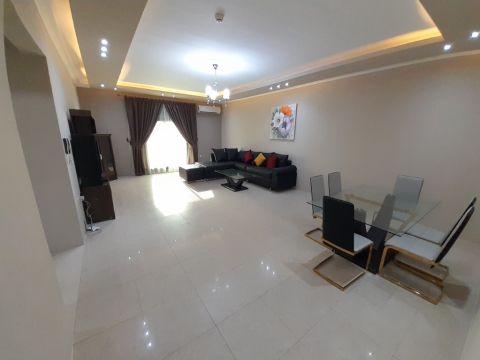 A fully furnished luxury apartment for rent in Isa Town, containing two bedrooms, two bathrooms, a large living room, a kitchen, a guard, and a parking space. The price is 280 Bahraini dinars, including electricity.