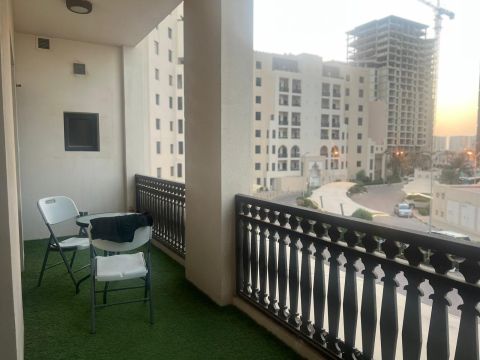 For rent A luxurious apartment in Diyar Al-Muharraq, Dilmunia Island, with a sea view. It consists of one bedroom, two bathrooms, a spacious living room, an open kitchen with everything including appliances, a balcony, free high - speed internet, a swimming pool, a children'swimming pool, a jacuzzi, a barbecue area, children'playground, an indoor children'area, sauna area, steam room, a