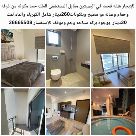 Bahrain - Buseiteen: For rent, a luxurious apartment in Buseiteen opposite King Hamad Hospital, consisting of one bedroom, one bathroom, a living room with a kitchen, and balconies. 260 dinars including electricity and water, with a 30 dinar fee. There is a swimming pool, gym, and parking. For inquiries.