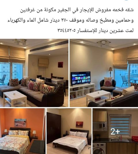 A luxurious furnished apartment for rent in Juffair, consisting of two bedrooms, two bathrooms, a kitchen, a living room, and a parking space. The rent is 350 dinars, including water and electricity, for twenty days. An opportunity not to be missed.