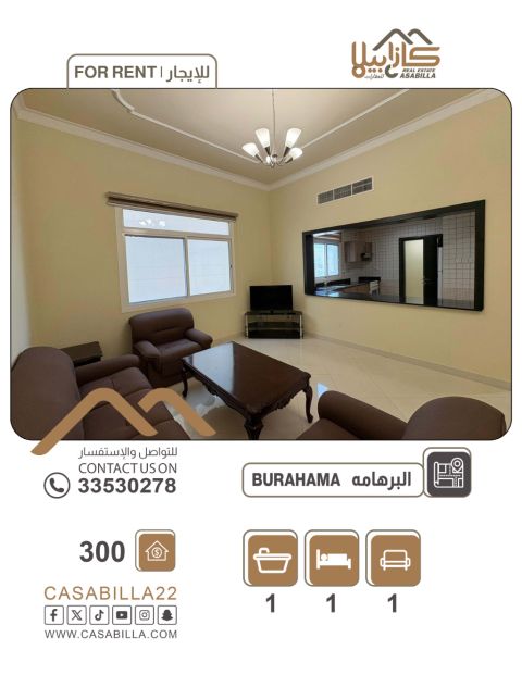 An apartment for rent in the Al-Barhama area. Modern and quiet living in the Al-Barhama area. Enjoy privacy and comfort in an elegant apartment located in the heart of the Al-Barhama area. The apartment features a strategic location that combines tranquility with easy access to all services and vital areas, making it the ideal choice for those seeking quality at a well-considered economical price. One room, living room, bathroom. Price: 280 dinars. Electricity limit: 20 dinars. For contact.