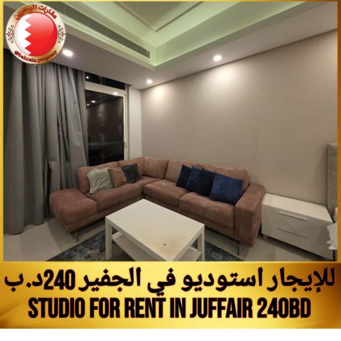 For rent: A studio in Juffair, Storm Tower, with an area of 45 square meters, including a room, kitchen, bathroom, and balcony. The rent is 240 Bahraini dinars, with electricity limited to 15 dinars. Facilities include reception, security, swimming pool, gym, barbecue area, and parking. For contact.