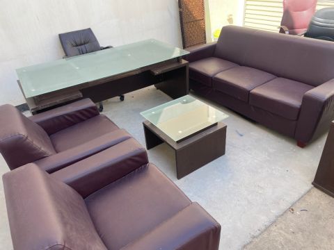 For sale: Office furniture consisting of a desk, 3 sofa pieces, and a small table - Price 160 dinars.