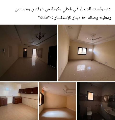 للإيجار: شقة أول ساكن في منطقة قلالي، تتكون من غرفتين وصالة وحمامين ومطبخ مغلق، مع موقف لسيارتين، كاميرات أمنية، ومصعد كهربائي. السعر 260 ديناراً شاملاً الكهرباء والماء، بحد أقصى 30 ديناراً.