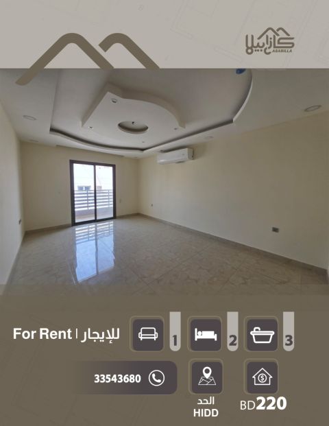 For rent: An apartment in a prime location in Al-Hadd, with air conditioners and curtains. First, apartment details: 2 master bedrooms, 3 bathrooms, a living room with a bathroom, a kitchen with a balcony. Second, facilities and services: elevator, building guard, shaded parking, near services. Rental price: 220 dinars excluding electricity. For contact.